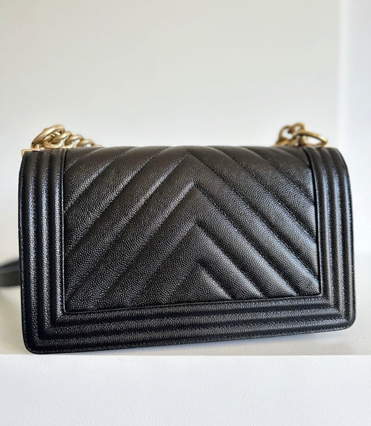 Chanel Black Chevron Medium Boy Bag Caviar Leather Matt Gold Hardware