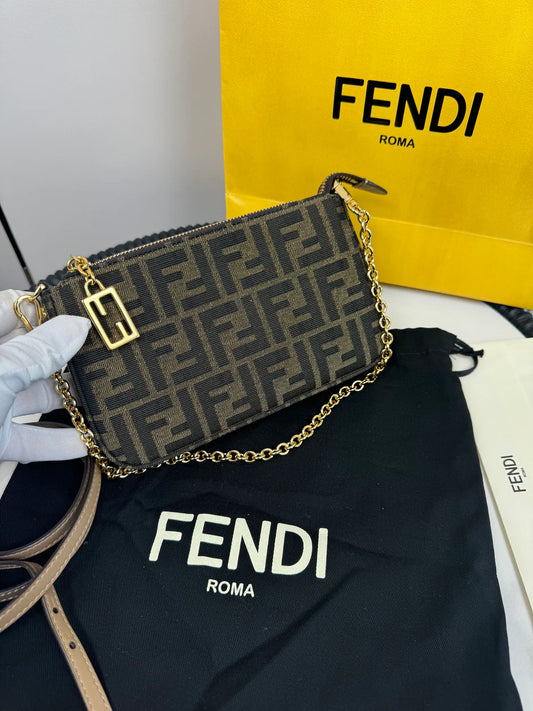 Fendi Baguette Pouch Brown jacquard FF fabric clutch with chain