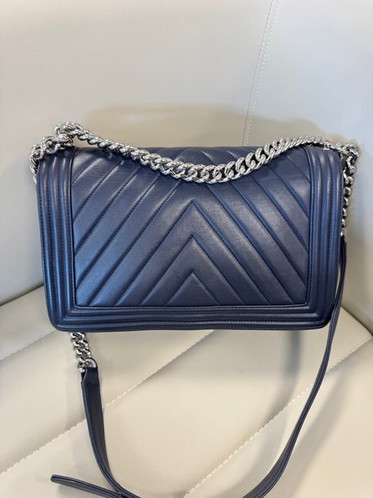 Chanel Lambskin Chevron Quilted New Medium Boy, Navy Blue